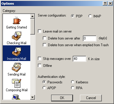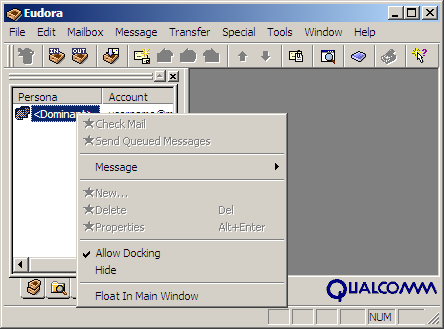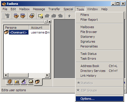 If you selected Lite Mode when you installed Eudora, you will not be able to access the dominant e-mail account's properties by right clicking in the Personalities window; the properties option is grayed out. Eudora only allows one e-mail account in Light Mode and you can only access the properties through Options.