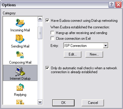 To do this, check the box Have Eudora connect using Dial-up networking.