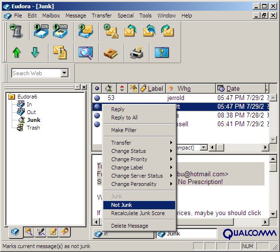 In the screenshot below, a junk message arrived in my inbox. All I need to do is right click the message and select Junk from the menu. Eudora will send the message to the Junk mailbox. Eudora will also learn from this, so the next time an e-mail comes matching the criteria of this e-mail, Eudora will label it as junk and send it to the Junk mailbox.