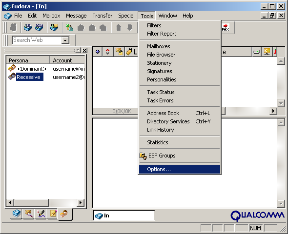 Below is a tutorial on setting up e-mail accounts. In Eudora, e-mail accounts are referred to as personalities. If you're a user with more than one e-mail account, Eudora can manage them for you. Just follow the screenshots below.