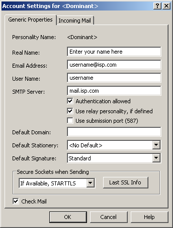 To enable SMTP authentication, check the box Authentication allowed. Eudora will use your e-mail address username and password to authenticate to the SMTP server.