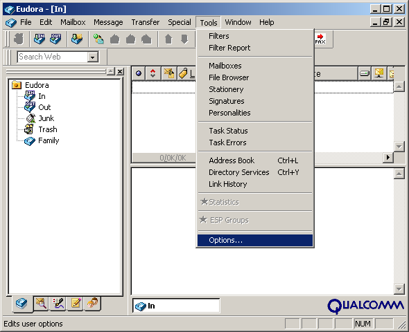 If you selected Lite Mode when you installed Eudora, you will not be able to access the dominant e-mail account's properties by right clicking in the Personalities window; the properties option is grayed out. Eudora only allows one e-mail account in Light Mode and you can only access the properties through Options. The following tutorial explains how to edit this mode.