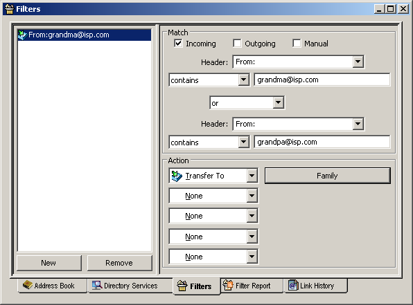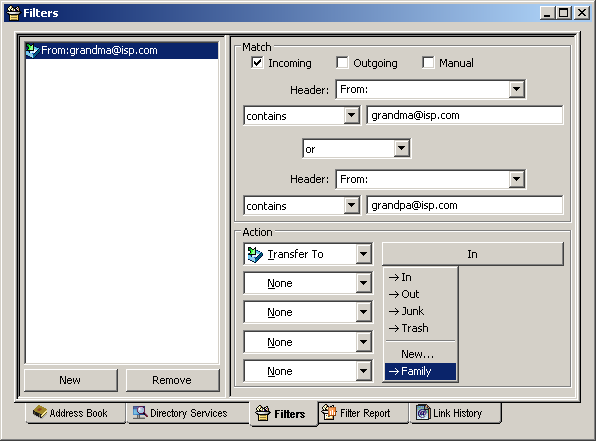 Now any e-mail that comes from the address you specified will be sent automatically to the folder you specify. In this example, any e-mail from 'grandma@ispname.com' will be sent to the 'Family' folder.