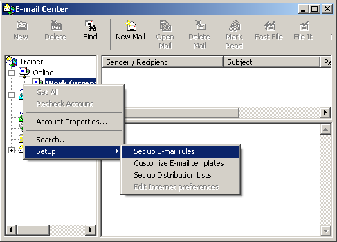 Right click in the Inbox area and select Setup -> Set up E-mail rules from the menus.