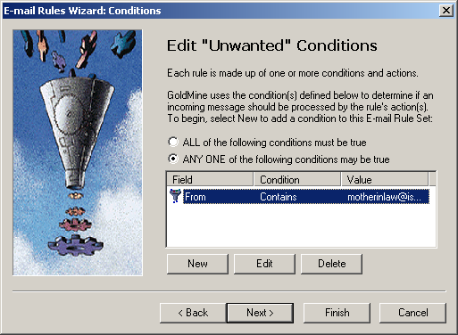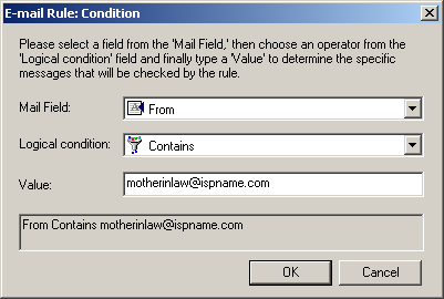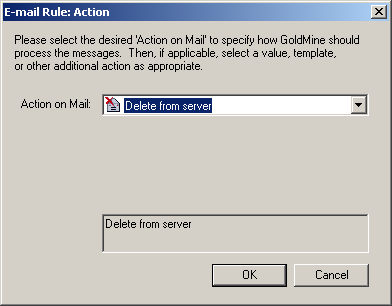 Now when an e-mail arrives where the From field contains motherinlaw@ispname.com, Goldmine will perform an action.  We'll stipulate the action next.