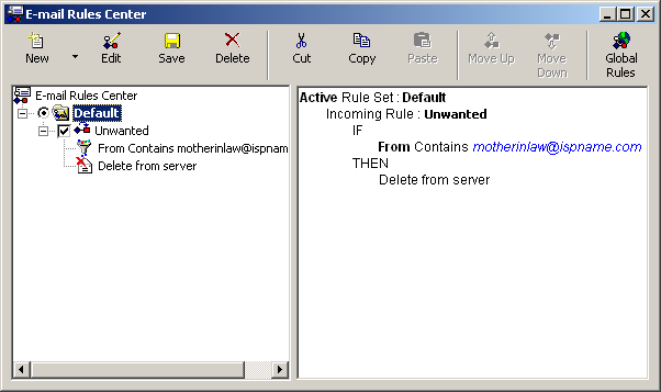 Anytime Goldmine receives an e-mail where the From line contains motherinlaw@ispname.com, it will delete the message.  You'll never see it in the Inbox.