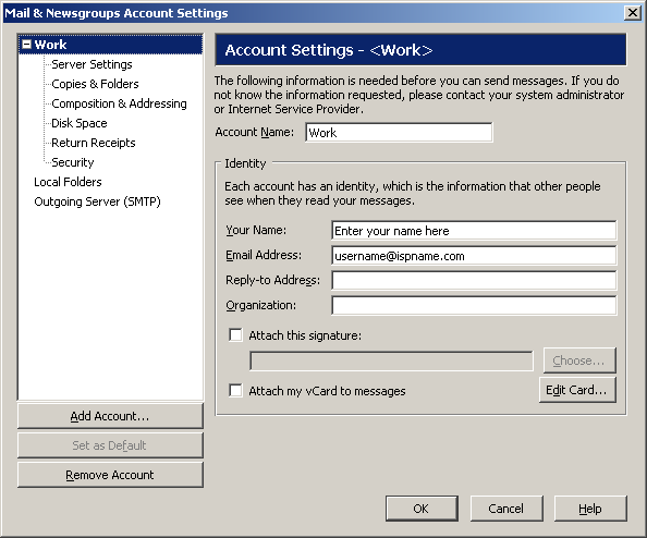 Server Name = The Outgoing (SMTP) mail server usually follows this format: mail.ispname.com (or .net). Replace the "ispname.com (or .net)" with your ISP's name.