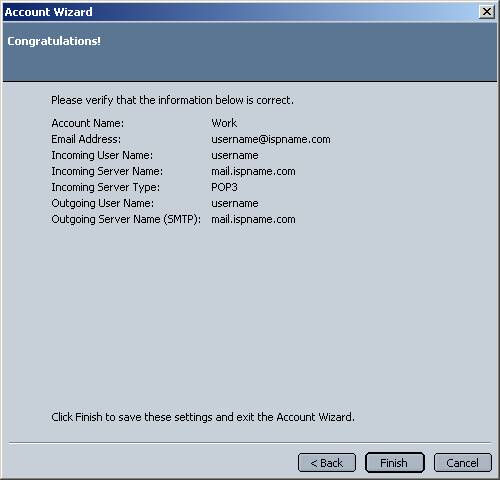 Incoming Server = The Incoming (POP3) mail server usually follows this format: mail.ispname.com (or .net). Replace the "ispname.com (or .net)" with your ISP's name.