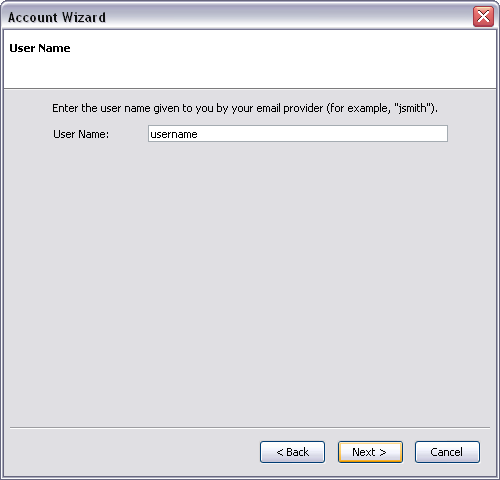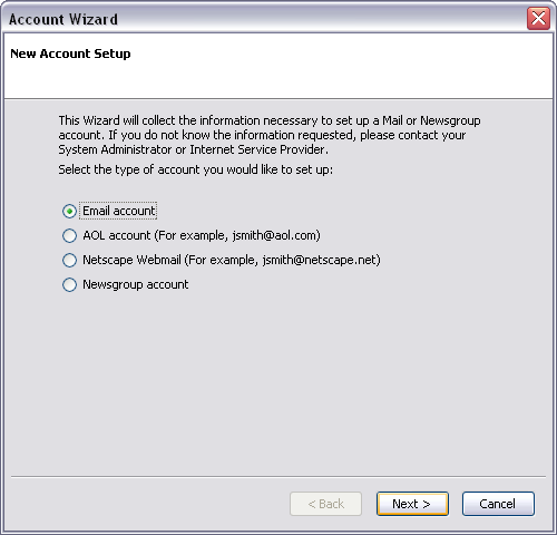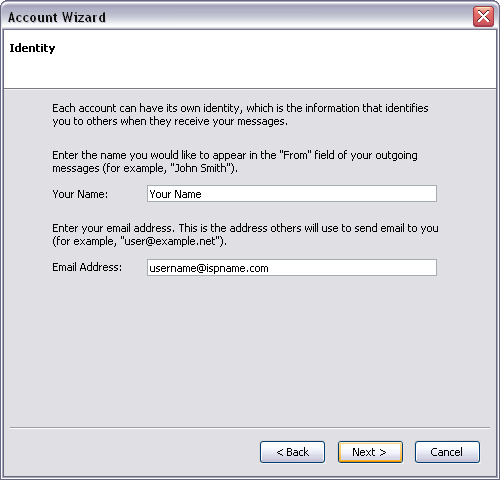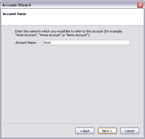 Account Name = Enter a name for the e-mail account. It doesn't matter what you call it, but it should be distinctive. This will help you distinguish it from any other e-mail accounts you create.