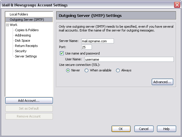 The Advanced Outgoing Server (SMTP) Settings window appears.