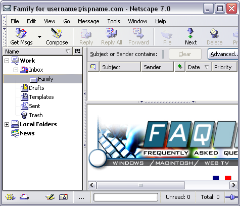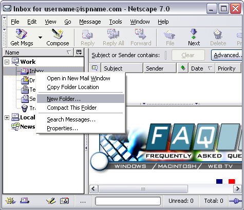 A folder is used for storing e-mails. For example, your Inbox stores new and undeleted e-mail while your Outbox stores e-mail waiting to be sent. You can create new folders to hold specific types of e-mail. You can even enable Netscape to automatically filter and place those emails in the folders you create when the e-mail arrives. For information on filtering, click the 'Message filters' link above.