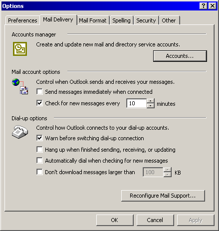 Note the three sections: Accounts manager, Mail account options, and Dial-up options. We'll discuss the latter two.