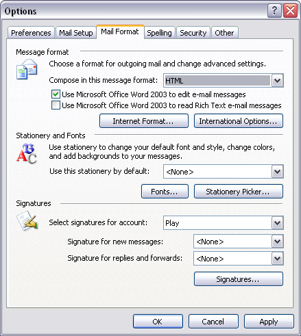 On the Mail Format tab you can select the type of font and stationary for the messages you create and send.