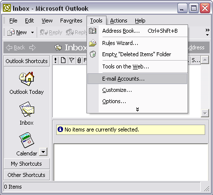 On the Toolbar, click Tools and select E-mail Accounts from the menu.