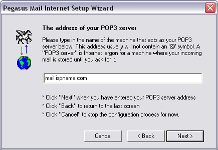 The address of your POP3 server = The Incoming (POP3) mail server usually follows this format: mail.ispname.com (or .net). Replace the "ispname.com (or .net)" with your ISP's name.