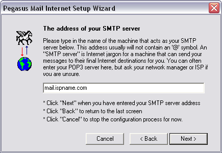 The address of your SMTP server = The Outgoing (SMTP) mail server usually follows this format: mail.ispname.com (or .net). Replace the "ispname.com (or .net)" with your ISP's name.