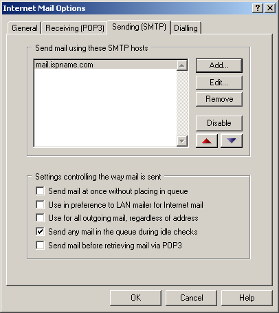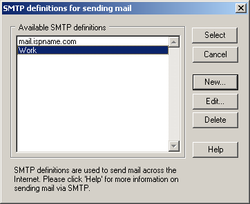 The SMTP definitions for sending mail window appears.