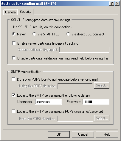 The Settings for sending mail (SMTP) screen appears.