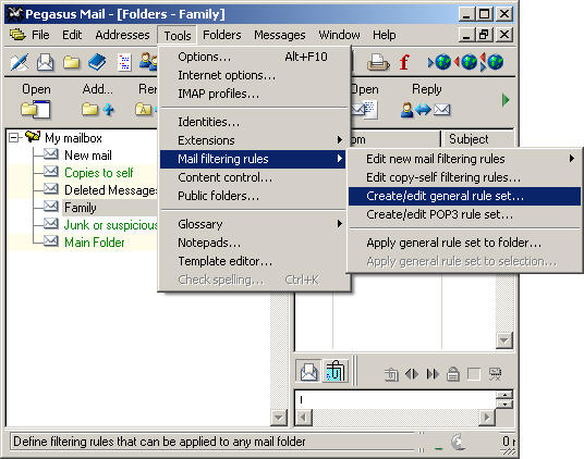 On the Toolbar, click Tools, select Mail filtering rules, and then Create/edit general rule set from the pop-out menu.
