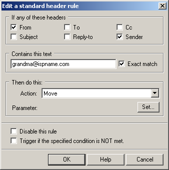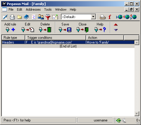 The new rule now appears in the list of rules. Any e-mail that "grandma@ispname.com" sends will be forwarded automatically to the "Family" folder.