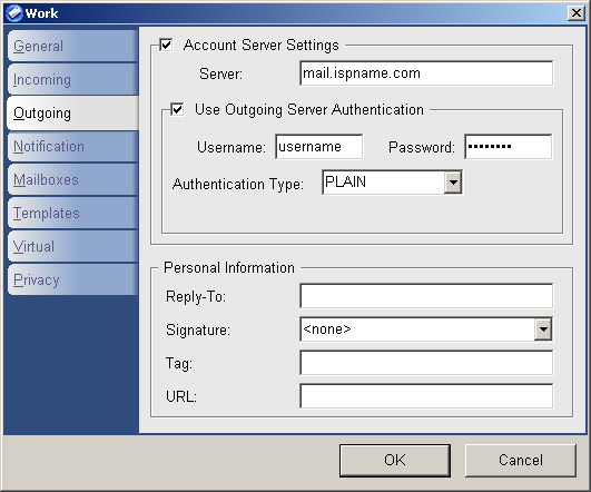 SMTP (outgoing) Server  =  The Outgoing (SMTP) mail server usually follows this format: mail.ispname.com (or .net).  Replace the "ispname.com (or .net)" with your ISP's name.