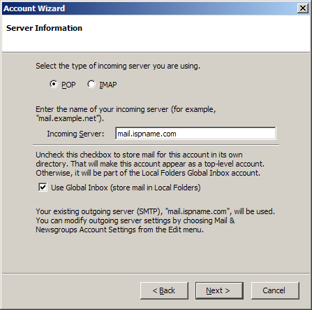 Incoming server = The Incoming (POP3) mail server usually follows this format: mail.ispname.com (or .net). Replace the "ispname.com (or .net)" with your ISP's name.